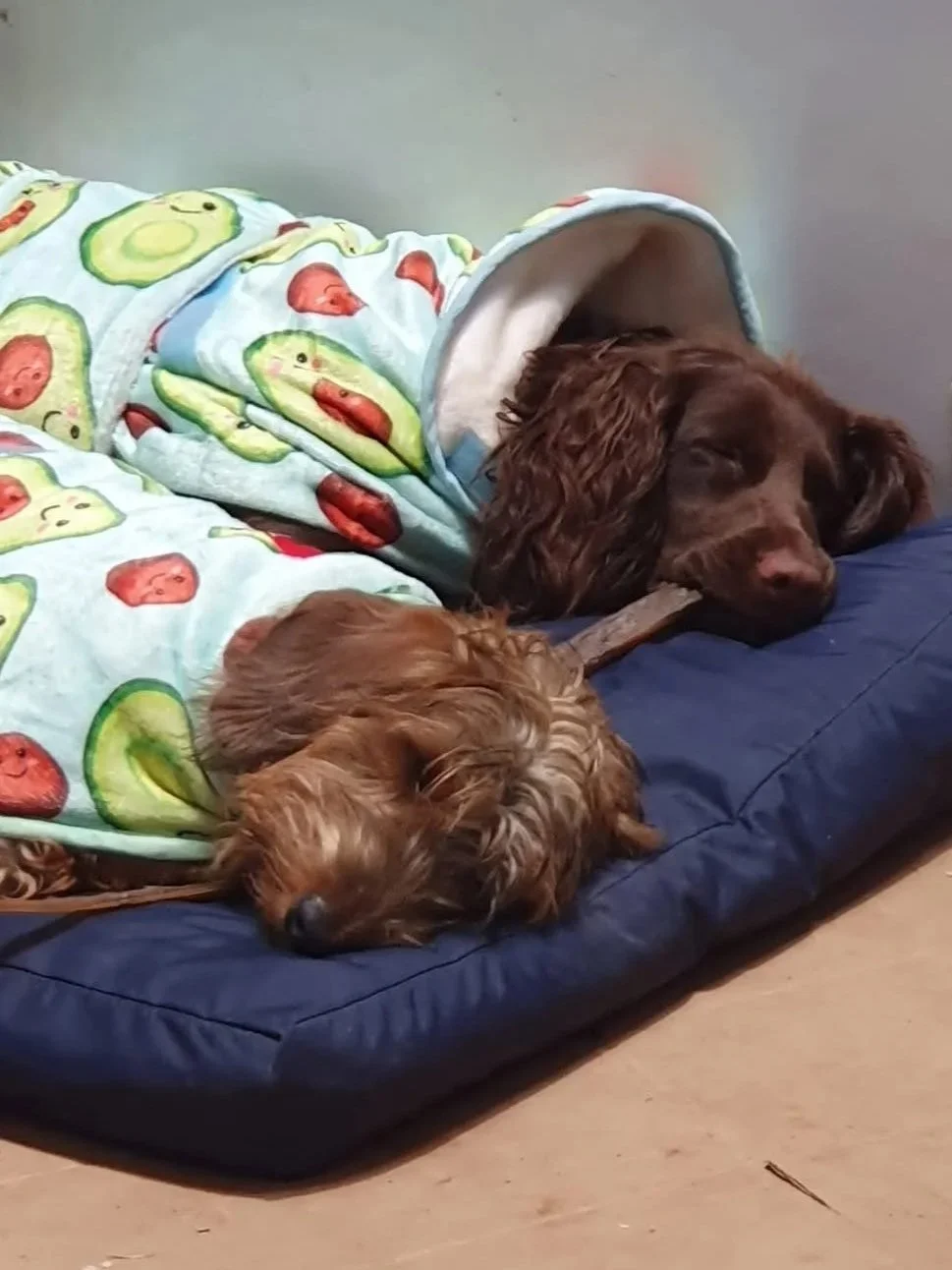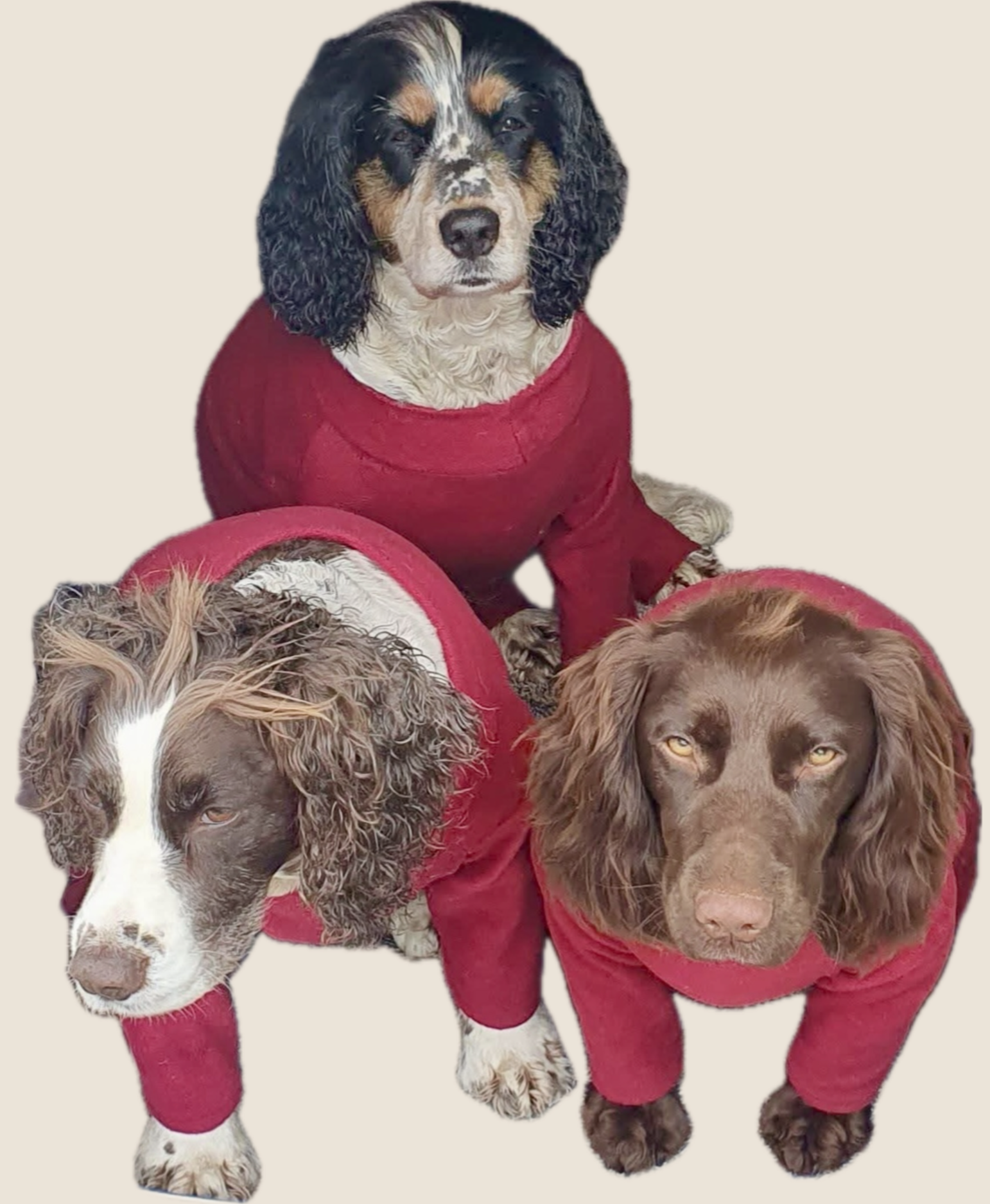 Four dogs wearing matching blue hoodies with orange, yellow, and green polka dots, standing on a furry rug. The dogs are of different breeds and sizes, with three having long ears and one with a distinctive black and tan face.